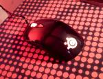 De prime abord, on a affaire à une souris très classique pour la forme : neutre, symétrique et ambidextre. Les gauchers apprécieront. Côté taille, la souris se situe plutôt dans la moyenne basse. Elle épouse assez bien la forme de la main, mais reste un peu courte pour soutenir un poignet d'adulte.On note un léger renfoncement sur chaque tranche, afin d'améliorer la tenue du pouce. Les matériaux utilisés sont également différents : sur la face supérieure, un revêtement « glossy » qui sera au contact des doigts et de la paume — joli, mais un peu salissant à l'usage — et sur les côtés, un habillage en gomme plus adhérent pour améliorer la prise en main.