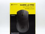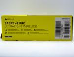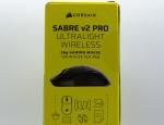 Corsair ne révolutionne pas son packaging et nous avons une boite bicolore noire et jaune, avec une illustration de la souris sur la face avant, entourée du logo de la marque ainsi que du nom du modèle, la Sabre v2 Pro dans le cas présent avec les mentions Ultralight et Wireless sous le nom. Deux mentions sont présentes sur le bas, une en français et l'autre en anglais, qui sont la traduction l'une de l'autre : 36g gaming mouse / souris de jeu 36g.