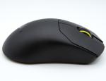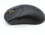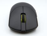 La Sabre v2 Pro est presque intégralement noir mat. Les seules zones qui changent sont les bords extérieurs de la molette qui sont jaunes et et la partie se trouvant sur l'avant de la gauche de la souris qui a des dessins géométriques gris et l'inscription « //SABRE ». Les deux boutons actionnables au pouce sont de couleur noir brillant. En dehors de ces deux interrupteurs, le design de la souris est symétrique avec une forme cintrée sur le centre et évasée sur l'arrière. Sur le plan des boutons, la Sabre v2 Pro ne possède que les clics droit et gauche, les deux boutons au pouce et la molette qui est cliquable. Il n'y a pas d'interrupteur pour changer les DPI à la volée. Sur l'arrière de la coque, Corsair a apposé son logo en noir brillant.