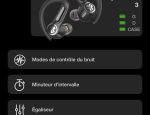 L’interface se veut simple et lisible, avec de larges boutons donnant accès aux principales fonctionnalités. On retrouve notamment la gestion des modes de contrôle du bruit, l’égaliseur, les commandes tactiles ainsi que divers réglages pratiques.