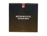 Contrairement à ce que Noctua propose habituellement pour son packaging avec ses couleurs blanc, marron et noir, ce NH-D15 G2 étant de la série chromax.black, la boite est noire avec des écritures blanches et un léger liseré marron en bas. Sur la face avant, il y a une photographie du ventirad en vue de 3/4 haut, en bas à droite, nous avons le nom du modèle avec la mention « all-black next gen dual tower cooler », en haut, le nom de la série « chromax by Noctua » et en bas à gauche, le fait qu'il y a dans la boite 2 ventilateurs NF-A14x25r G2 et une seringue de pâte thermique NT-H2.
