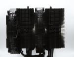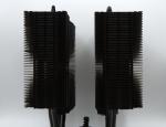 Contrairement au NH-D15 chromax.black, le NH-D15 G2 utilise huit caloducs au lieu de six. Ces 8 caloducs partent de la base en aluminium nickelé pour remonter au centre des 2 tours d'ailettes en aluminium. On remarque également que les deux tours d'ailettes sont découpées sur la partie inférieure, pour faciliter la compatibilité avec les grandes barrettes de RAM, ce qui est une fonctionnalité très intéressante, car ainsi, les barrettes restent accessibles, même celles au plus près du CPU. Sur le dessus, il n’y a rien d'autre qu'un logo Noctua présent sur 1 seule des 2 tours. L'espace entre les ailettes passe de 1,9 mm sur la première génération du NH-D15 à 1,6 mm sur ce G2 ce qui augmente la surface de refroidissement de 20 %.