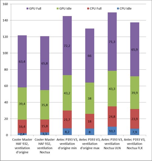 On a beau faire tous les tests théoriques possibles, rien ne vaut une petite mise en situation pour voir la vraie valeur des ventilateurs. Ainsi, nous allons remplacer les trois ventilateurs d'origine du Cooler Master HAF 932, qui font 230 mm de diamètre par seulement deux NF-A14 FLX, nos 140 mm. Par la suite, nous placerons les deux ventilateurs Noctua dans l'Antec P193, à la place des 140 mm en haut de la tour mais en laissant le 230 mm (sur le côté) et le 120 mm (à l'arrière. Je vous laisse apprécier les résultats dans le tableau suivant. La colonne « Delta Temp » correspond à la différence entre la température mesurée et la température ambiante.