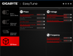 EZ Tune est la version modernisée de Easy Tuner 6 qu'on trouvait habituellement dans le pack de logiciels de la marque. Il offre plusieurs modes de fonctionnement, avec des presets de fréquence pour overlocker, ainsi qu'un mode avancé, proposant bien en plus de réglages ainsi qu'une gestion par profiles. On peut donc en fait changer les paramètres à la volée sous Windows, mais il faut savoir ce qu'on fait, sinon c'est le freeze assuré.L'outil propose également de visualiser les informations du processeur et de la RAM, exactement comme avec CPU-Z, sur lequel Gigabyte s'est peut-être basé, ce qui peut éviter de l'installer.