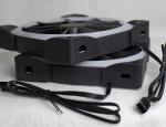 Deuxième partie de ce kit, les ventilateurs. Les AER RGB sont proposés en 120 et 140 mm ; nous avons ici la plus grande dimension. Nous retrouvons donc un ventilateur assez imposant à cause de ses patins aux quatre coins. Le design suit le module HUE2 avec sa sobriété et ses formes simples. Ils sont composés de 9 pales et leur forme est étudiée pour optimiser la ventilation. On va retrouver tout autour le module d'éclairage qui va pouvoir s'illuminer de 16,8 millions de couleurs et avec de nombreux effets !À l'arrière, le cœur du ventilateur : le moteur, étiqueté du nom du fabricant. De ce moteur sortent les 4 fils plats qui permettent la connexion à la carte-mère. Au bout du parcours d'une longueur d'environ 60 centimètres , vous retrouverez une sortie 4 broches. Cela permet de gérer le PWM et donc que la carte-mère régule d'elle-même le tout.
