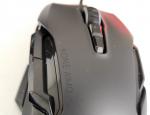 Sur cette vue, on aperçoit la surface antidérapante et adhérente citée juste avant. Deux boutons sont également présents juste à proximité de la molette, ils permettront de base de changer de profil de DPI à tout moment. Située juste en face de ces boutons, la molette « Titan Wheel 4D » – qui avait été abandonnée sur la Roccat Leadr – est rétroéclairée, de type cranté. En outre, elle s'actionne dans les quatre directions. Tout cela sans oublier les deux zones de lumières RGB de part et d'autre de la souris qui offriront une illumination non négligeable à l'engin. Sur la partie basse, on retrouve le logo du constructeur, mais il est cette fois beaucoup plus petit et plus sobre sur cette version remastérisée. Même constat sur le nom du modèle, près des boutons latéraux, il se fait cette fois très discret, contrairement à la version de base.Côtés