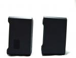 Le dessous des Evolv Mini Sound est équipé de quatre pieds en caoutchouc antidérapant plus épais sur l’avant que l’arrière pour surélever légèrement la sortie de son. Il y a aussi le nom de la marque et du produit, le numéro de série ainsi que l’indication « Speaker Right » et « Speaker Left » pour différencier l’enceinte gauche et droite.