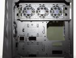 Lorsque nous enlevons le panneau en verre trempé du In Win 309, nous constatons immédiatement que l'architecture interne n'est pas commune. Ici, l'alimentation n'est pas installée en bas comme dans beaucoup de boîtiers actuels et nous ne voyons pas de support pour un quelconque radiateur en top ou en face avant. Pour ce qui est du refroidissement, il y a un ventilateur de 120 mm en extraction à l'arrière et 3 autres ventilateurs identiques sont présents en plein milieu du châssis. Il est à noter que ces ventilateurs sont connectés les uns aux autres pour limiter le nombre de câbles.