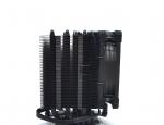 Globalement le ventirad est assez amusant à voir, il est exactement comme un ventirad habituel, mais en beaucoup plus compact. Ses lignes sont nettes et épurées, le noir est vraiment bien brillant et l’ensemble donne un look pro et sobre à la fois. Le NH-U9S est déjà équipé du ventilateur, celui-ci est bien sûr noir aussi et est maintenu avec les clips. Les pads antivibrations sont présents des deux côtés. On note tout de même que la vis de serrage sur NH-U9S sur le support de la carte mère se trouve sous le ventilateur, il faudra donc fatalement l’enlever pour la fixation et ensuite le remettre en place dans un espace réduit dû au format ITX. Les côtés droit et gauche sont identiques, les fines ailettes sont bien espacées et régulières et on peut voir les 5 caloducs placés de différentes façon afin de maximiser les échanges avec le flux d’air et la plaque de contact du CPU.