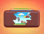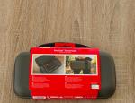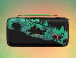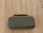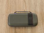 La housse en elle-même est construite dans un matériau rigide, façon coque EVA, capable d’encaisser chocs et écrasements légers. À l’extérieur, elle affiche un look sobre, avec une finition gris foncé et une bande noire traversée par un double liseré bleu/rouge rappelant les couleurs emblématiques de Nintendo. On retrouve également une petite poignée renforcée pour faciliter le transport.