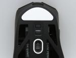 Le dessous possède deux patins lisses permettant une bonne glisse, le capteur au centre est entouré d'un petit patin et, sur l'avant de ce dernier, l'interrupteur de mise sous tension pour utiliser la souris en wireless. Dans le bundle fourni par be quiet!, il y a un jeu supplémentaire de patins de glisse. Sur cette face cachée, il y a également l'interrupteur pour changer la sensibilité DPI sans passer par le logiciel de la marque. Les zones sur le côté du capteur sont ouvertes et les composants électroniques sont visibles, ceci dans le but de gagner quelques précieux grammes.