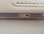 Au dos du clavier, on retrouve des patins en caoutchouc antidérapants disposés aux coins, mais l'absence de pieds inclinables pour ajuster l’angle de frappe. Une étiquette rappelle le modèle et quelques informations réglementaires, ainsi que la capacité de la batterie intégrée.Intelligence et optimisation obligent, le dongle se trouve dans une petite trappe au dos protégée par une plaquette aimantée d'un côté. Smart !